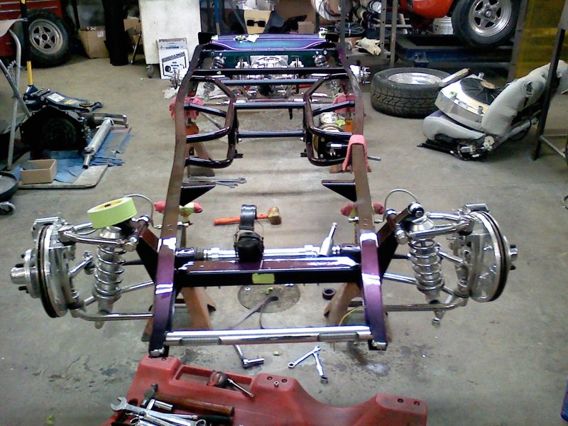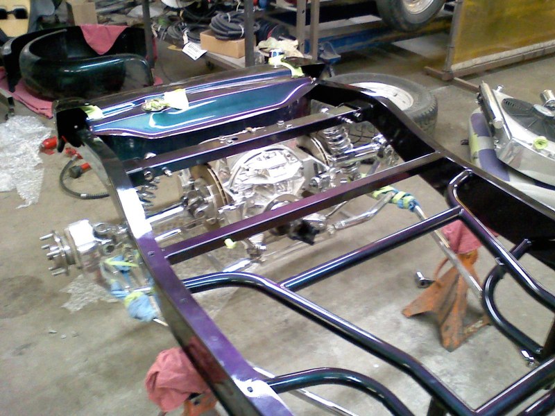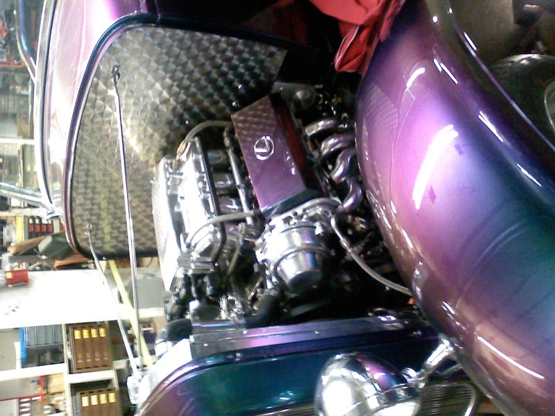 We received this car from another shop that had no idea how to make it work. Midnight completely rebuilt the whole car. Custom transmission adapter plate to mate the Lexus V8 to a GM 700R4 transmission. Built a custom wiring harness. Fabricated custom valve covers. Redid the dash, hooked in the heater and A/C controls installed. Made the interior from scratch. Reengineered the steering linkage. Performed all plumbing and wiring. Built a custom exhaust, including custom headers. Resquared the rear end, which had been installed incorrectly. Installed poppers in the doors and did all the necessary work to make the top work correctly. Performed numerous tasks related to fit and finish.
